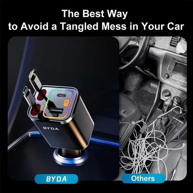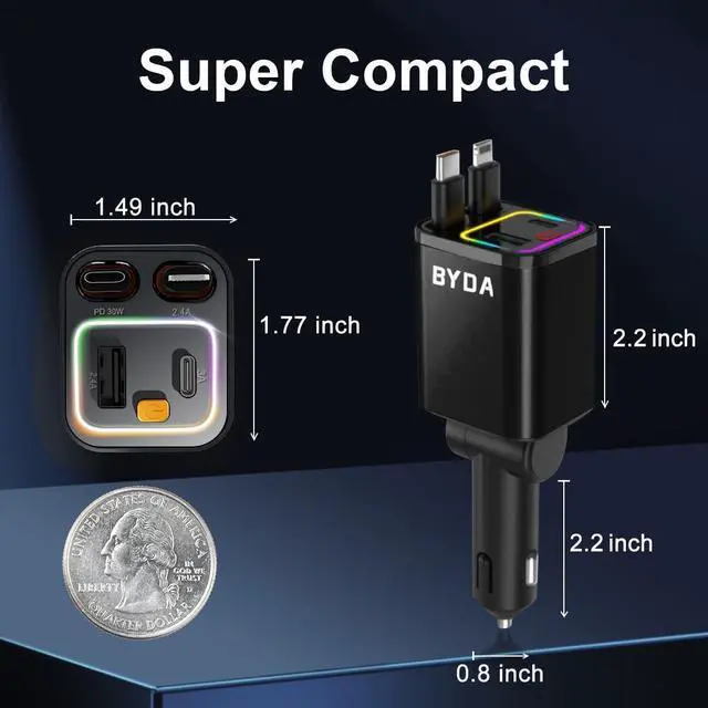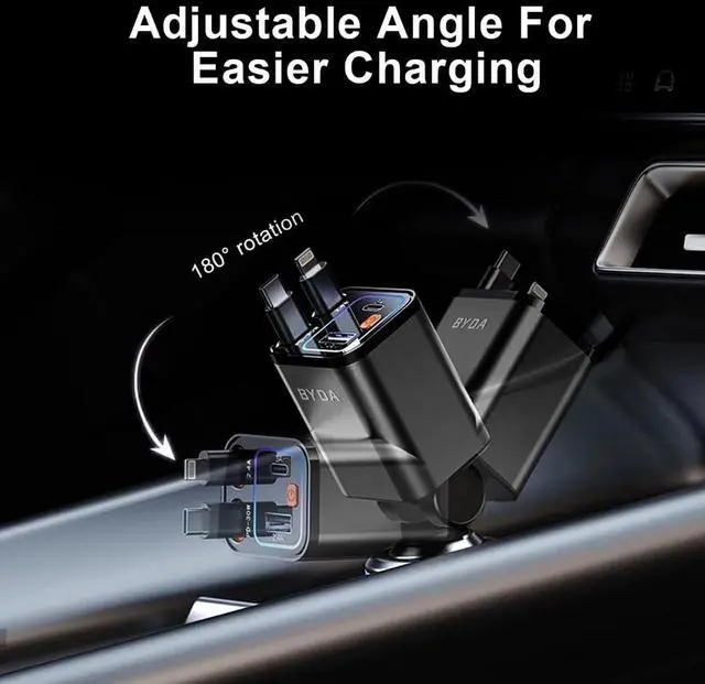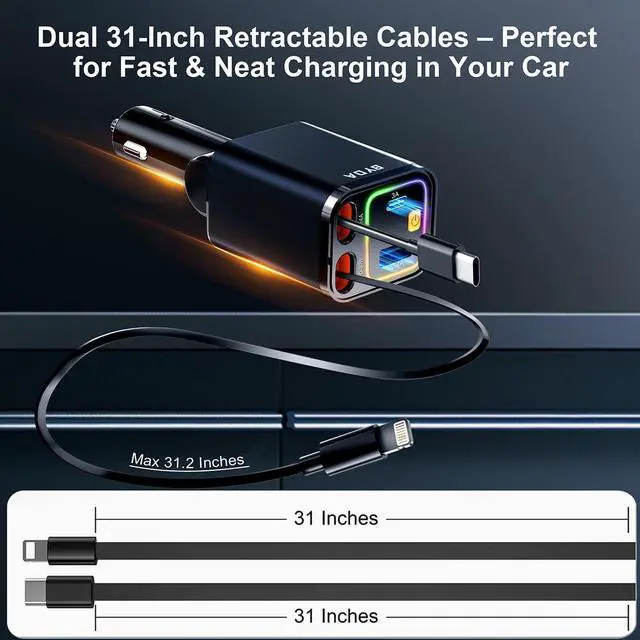 • SPACE-SAVING DESIGN WITH POWERFUL PERFORMANCEThis 4-In-1 Retractable Car Charger Combines A Compact Size With Powerful Charging Capability. Designed To Fit Snugly Into Your Car'S Interior, It Rotates 160° And Is Compatible With 12v Cigarette Lighters (0.8-Inch Width, 2.8-Inch Depth). Its Retractable Cable Extends Up To 31 Inches, Keeping Your Car Organized. A Perfect Blend Of Space-Saving Design And Functionality, This Charger Is An Ideal Gift For Truck Drivers, Commuters, Or Anyone Who Needs Quick And Efficient Charging On The Go