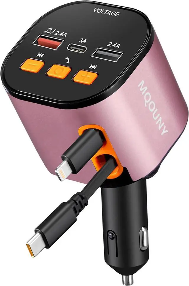 PD Retractable Cables - To enhance your driving experience, our fm transmitter includes a 30 W USB C and a 12 W USB iPhone retractable cable, eliminating the need for extra cords and effortlessly charging for both Apple and Android devices. The retractable cables of car charger extend up to 80cm and retract smoothly for a tidy car interior