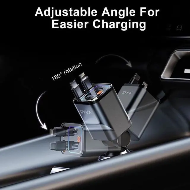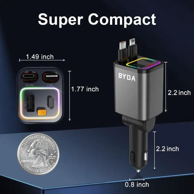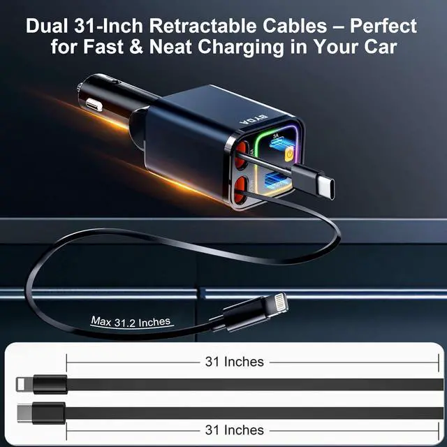 SPACE-SAVING DESIGN WITH POWERFUL PERFORMANCEThis 4-In-1 Retractable Car Charger Combines A Compact Size With Powerful Charging Capability. Designed To Fit Snugly Into Your Car' S Interior, It Rotates 160° And Is Compatible With 12v Cigarette Lighters ( 0.8 -Inch Width, 2.8 -Inch Depth). Its Retractable Cable Extends Up To 31 Inches, Keeping Your Car Organized. A Perfect Blend Of Space-Saving Design And Functionality, This Charger Is An Ideal Gift For Truck Drivers, Commuters, Or Anyone Who Needs Quick And Efficient Charging On The Go