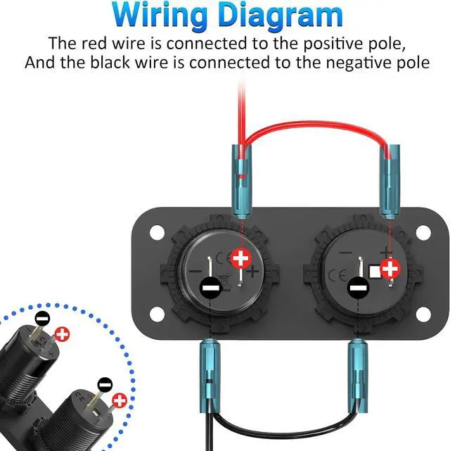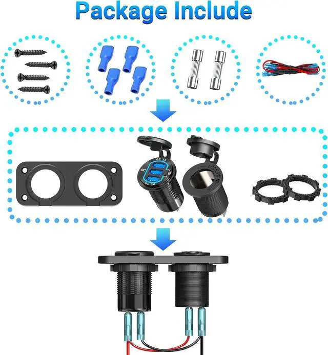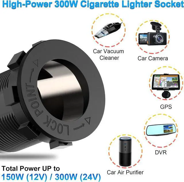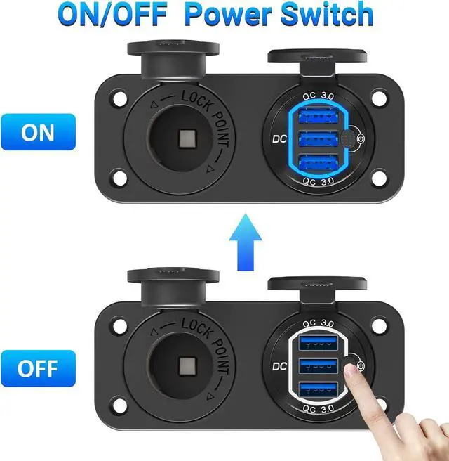 Convenient 12V Charger Socket PanelThe cigarette socket panel kit includes an aluminum metal Triple QC 3.0 12V USB Outlet with Power Switch, High-Power 200W Cigarette Lighter Socket, Wire with 15A Fuse. 2 in 1 compact design, saving space.