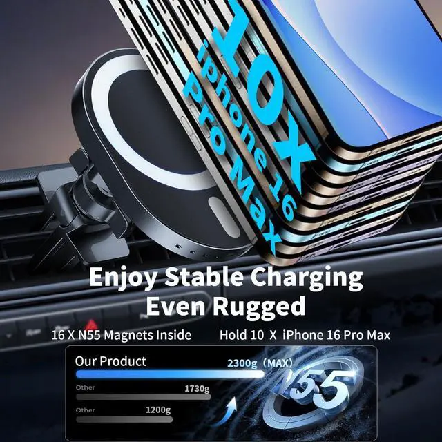 Strong Magnetism: This product is also a reliable car phone holder, it is equipped with 16 powerful N55 magnetsand has a maximum magnetic force of 2.3 kg, enough to hold 10 for iPhone 16 Pro MAX (227g each); It prevents phone drops, ensuring driving safety, and can be used even in off-road vehicles;