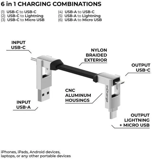 Unique Design: This universal cable cord' s patented design allows you to connect any portable device to any power source for charging: USB to USB-C, USB to Lightning, USB to Micro USB, USB-C to USB-C, USB-C to Lightning and USB-C to Micro USB