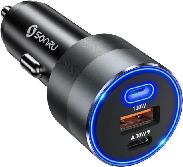 130W Fast Charging SONRU USB C car charger, equipped with 2 Type-C ports and 1 USB A port, supports PD-1 100W (max), PD-2 30W (max) and QC 30W (max) high output, and is compatible with PD3. 0/QC 4.0 /QC 3.0 /AFC and FCP super fast charging protocol. Charges iPhone 14 Pro from 0-65% in 30 minutes. Charges most Android devices from 0-70% in 30 minutes