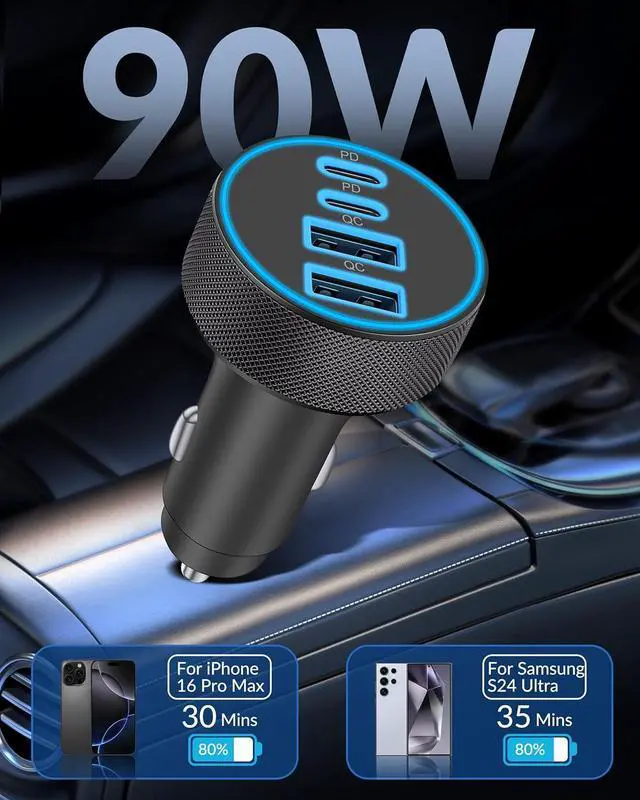 You Get: 1 x 90W 4-Port USB C Car Charger Fast Charging Compatible with 12-24V Cars Trucks SUVs Pickup Truck etc. Road Trip Essentials Car Accessories for Men Women