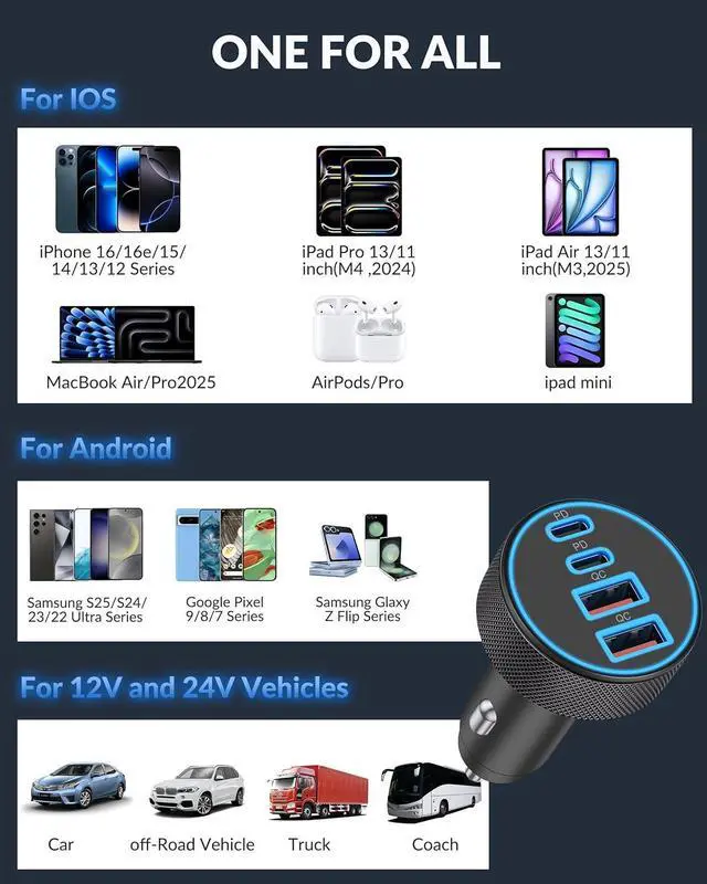 Car Charger: Car phone charger supporting PD 45W (Max) and QC 45W (Max) high output can fast charge all prevailing cell phones and E-devices. This cigarette lighter adapter features 4-ports (2 USB-C and 2 USB-A ports) allows charging 4 devices simultaneouslyWidely