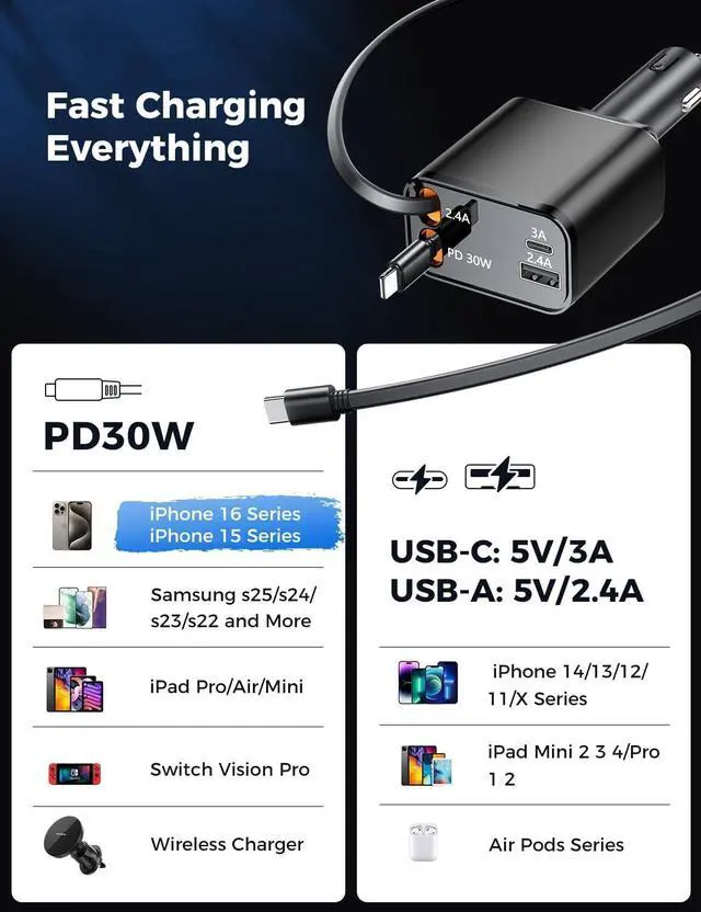 Charging Solution: Equipped with a real PD 30W USB-C and 12W USB cables a 15W USB-C port and a 12W USB-A port this car charger usb c offers fast charging for up to four devices simultaneously. No need for multiple chargers meet all your charging needs with one compact device.