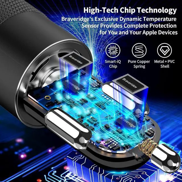 Coiled Lightning Cable: Original C94 Terminal and 56 Pull-up Resistor adjust voltage & current output to match connected iPhone. Built-in Smart Chip full compatibility with iPhone 14/14 Plus/14 Pro/14 Pro Max/13/13 Mini/13 Pro/13 Pro Max/iPhone 12/12 Mini/12 Pro/12 Pro Max/SE 2020/11/11 Pro/11 Pro Max/XS/XS Max/XR/X/8 7 6 Plus iPad /3/2/1. The MFi Certified Lightning Cable provide overvoltage protection battery protector and automatic chip recognition function. 52.5W PD&QC 3.0 Car Power Cigarette Lighter