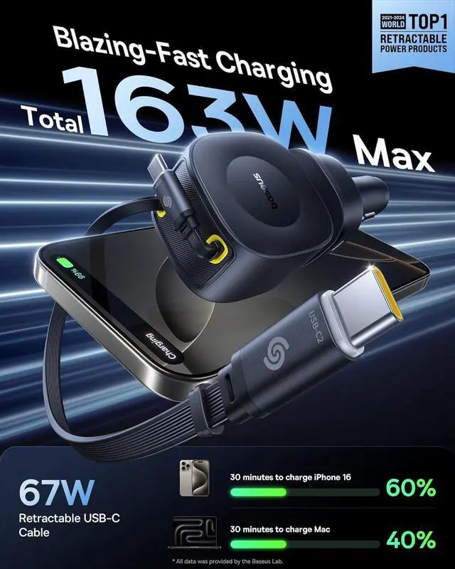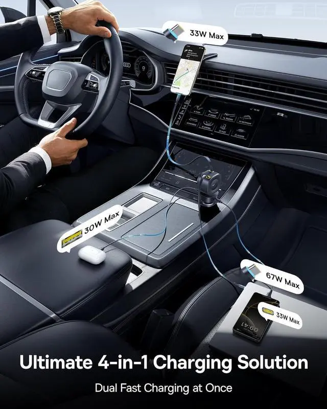 Retractable Car Charger: Experience lightning-fast charging for seamless office work on the go. Designed to support high-power devices such as laptops tablets and smartphones this fast charging car charger ensures your road trips and daily commutes hassle-free. It includes a 67W USB-C1 cable output a 33W USB-C2 cable output a 33W USB-C3 port output and a 30W USB-A port output a total of 163WCharge 4