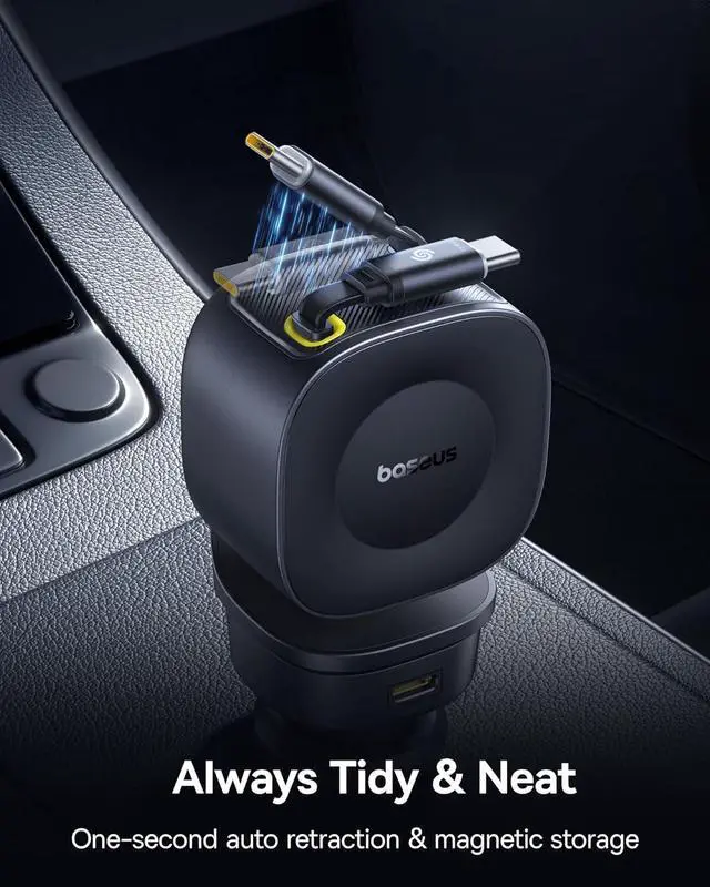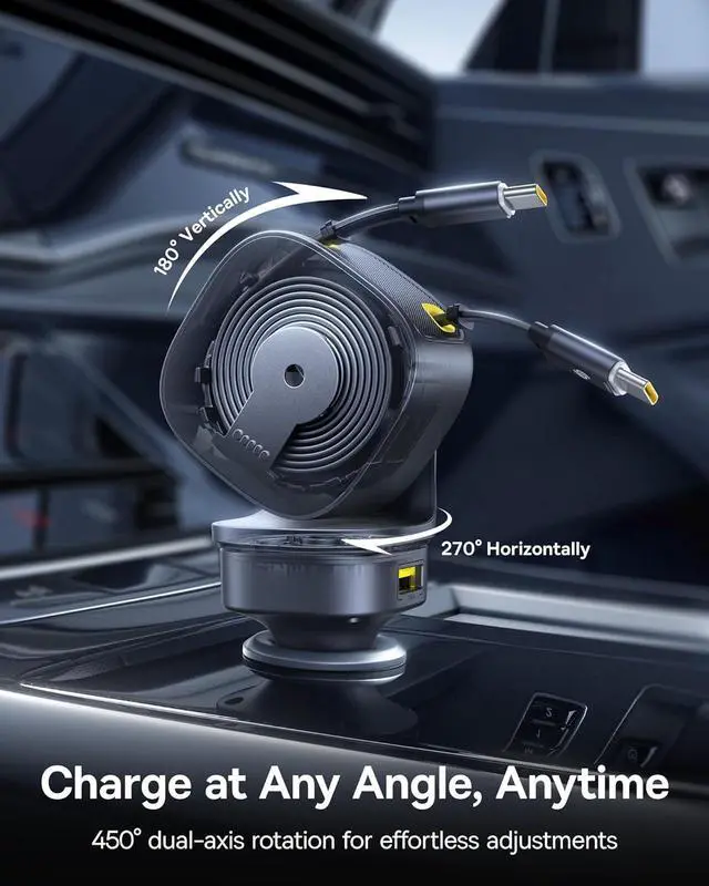 Retractable Cables: Say goodbye to cable clutter with Baseus retractable car charger. This car fast charger integrates two built-in retractable USB-C cables with secure magnetic storage always keeping your car interior neat and organized whether in use or after used. The dual cables are tested to endure over 10 000 smooth pulls and retractions built to last and accompany your every journey with reliability and peace of mind450°