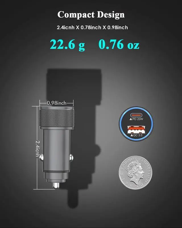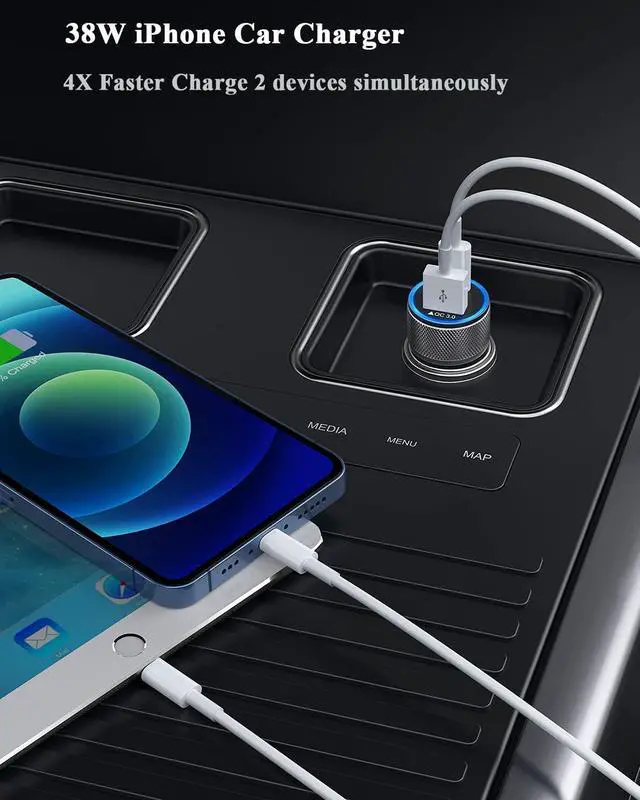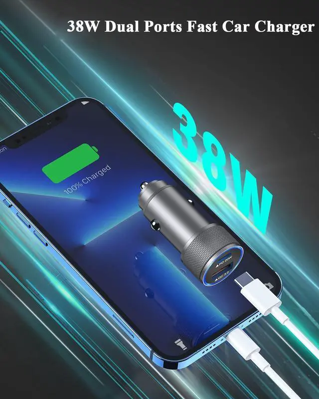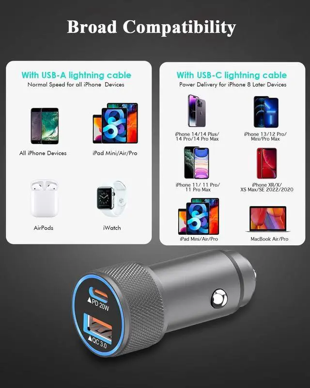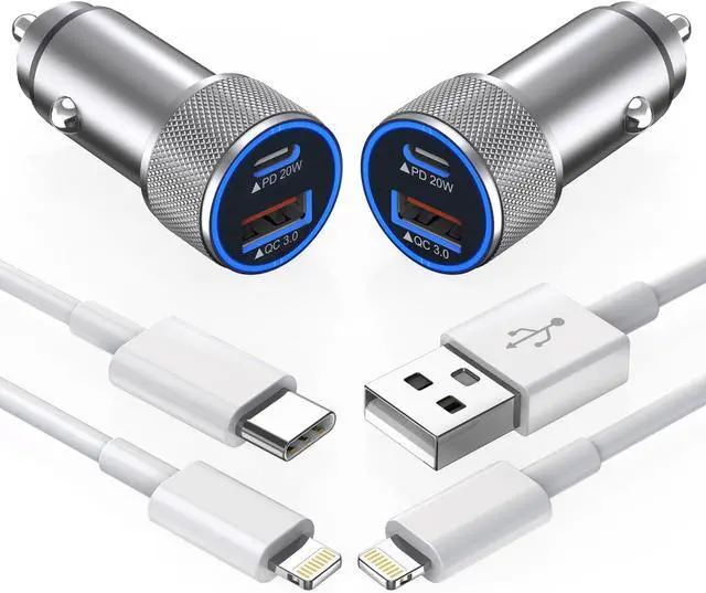 38W PD + QC 3.0 Fast Charger2Pack Multi-port super fast iPhone Car Charger Adapter delivers 38W max power in total one time from two ports supports fast charging two devices at full speed. 20W Fast USB C Charger and 18W USB A quick charge 3.0 port charging can save more time and create good travel times for you. Compatible Devices38W PD&QC 3.0 Fast Car Charger for iPhone flawlessly fit for device: iPhone 14/ 14 Plus/ 14 Pro/ 14 Pro Max iPhone 13/ 13 Mini/ 13 Pro/ 13 Pro Max iPhone 12/ 12 Mini/ 12 Pro/ 12 Pro Max iPhone 11/ 11 Pro/ 11 Pro Max/ SE 2020 iPhone X/ XR/ XS/ XS Max iPhone 8/ 8 Plus iPhone 7/ 7 Plus iPhone 6S/ 6S Plus/ 6/ 6 Plus iPhone 5/ 5S/ 5C/ SE AirPods 1/2/3/Pro/Max iPad and more Lightning device. LED Indicator Design38W Fast iPhone Car Charger has an LED indicator light to help easily find the charging port in the dark. Car Cigarette Lighter is very suitable for outdoor use in cars. The shrapnel contact design ensures that Car Charger is secure providing stable power to your device even on bumpy roads. Safe & ReliableThe all-aluminum alloy body is scratch resistant and has a built-in smart chip. iPhone Car Charger can automatically match the current required by the device. Effectively protect your device from various damages and ensure safer charging at night. Package List2 x Dual Port Car Charger iPhone (Grey)? 1 x 3.3 FT USB C to Lightning Cable? 1 x 3.3 FT USB A to Lightning Cable? One By One Professional Customer Service.