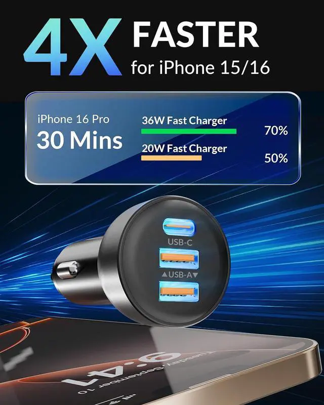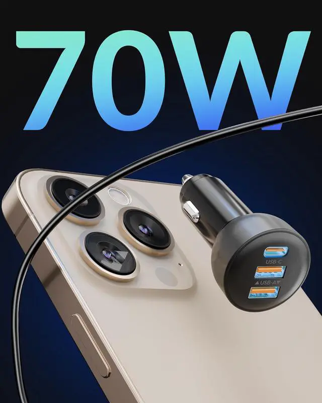 Fast Car Charger: Total 70 Watt car charger accessories Support PD Max 36W (USB-C) and QC Max 17W+17W (USB-A) fast charging speed 3-USB port output can charge for most devices simultaneously. one car charger for all your need your ideal travel companion.