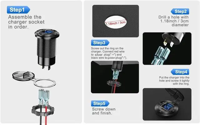 Easy installation: You can replace your car's original cigarette lighter socket with this USB charger. Or you can DIY the installation by drilling a 1.18 inch/3cm hole inserting the charger and tightening the ring then connecting the positive and negative wiresRed wire to Silver plug(+) Black wire to Golden plug(-). See the pictures for detailed installation instructions.