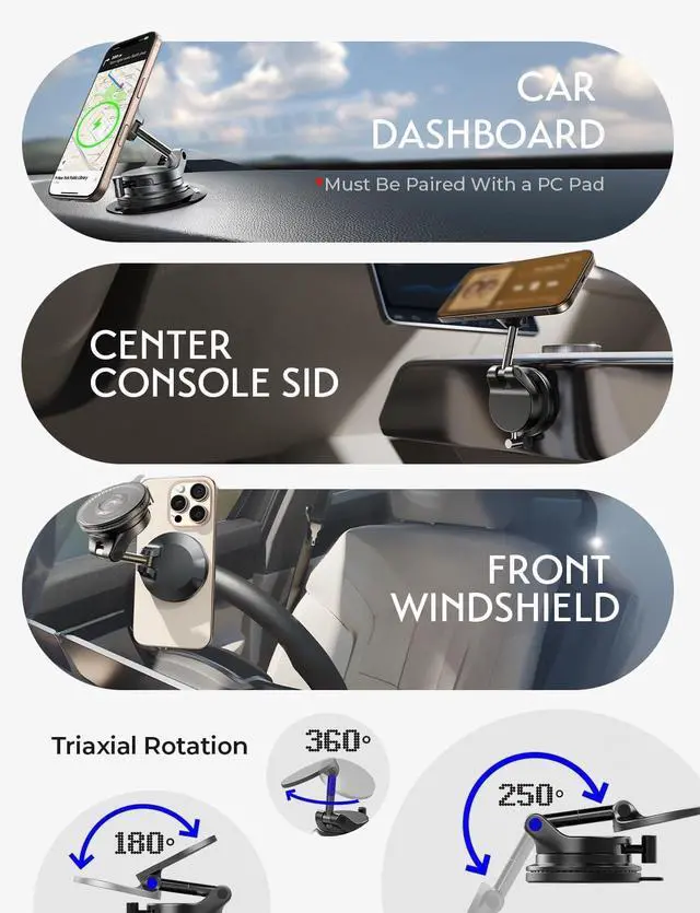 Tip: An 18W or higher power supply needs to be connected When the charging reaches 75% the charging speed will automatically decrease to protect your phone. [Rock-Solid Stability] The vacuum Magsafe car phone holder has a vacuum tension of 96 pounds and 20 N52 magnets (2800 gf) which can firmly secure your phone in the installation position in potholes hard brakes and cabin temperatures ranging from -40 ° C to 100 ° C. [Full-Range Flexibility] The Vacuum Magsafe suction car phone holder has the tri-axis metal arm swivels 360° tilts 210° folds 180° and detaches in seconds letting you fix the perfect angle anytime. Fixed base (no rotation) Center joint 360° only[What's in the Box? ] 1*Vacuum Magsafe suction car wireless charging stand 1*PC pad 1* 3.3F t USB A to USB C Plastic data cable 1*manual and 24/7 customer support with a 24-month for worry-free use. [???????????????????????????????????? ]?????????????????????????????????????????????????????????????????????????????????????????????????????????????????????????????????????????????????????????????????????????????????? (?????????????????? /?????? )