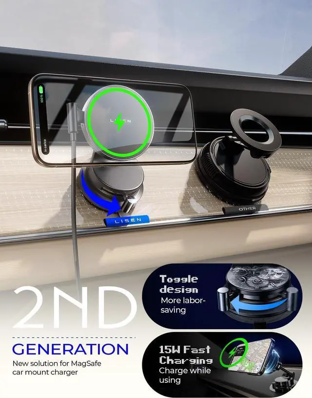 MagSafe car charger: enhanced paddle grip + 15W wireless charging. Watch videos shots Vlog navigateyour device stays fully powered always. [Important Installation Information] When using the Vacuum MagSafe car charger please install it on a clean smooth and flat surface or use it on the dashboard in conjunction with the provided PC pad; Leather textured or curved instrument panels cannot maintain vacuum sealing. [15W Fast Wireless Charging] This vacuum suction cup car holder is equipped with enhanced coils intelligent cooling and liquid silicone pads to control temperature increasing the temperature of iPhone 12-16 by about 50% within one hour;