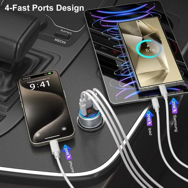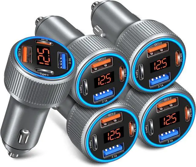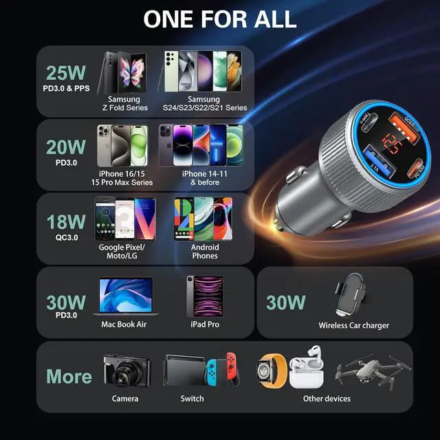 Fast Car Charger: With the upgrade QC 3.0 +PD Fast charging technology the 65 Watt high speed car adapter can support max PD 30W and QC 18W output simultaneously rapid charge for iPhone Galaxy tablets even Macbook and most android devices from 0% to 60% in 35 minutes. One car charger adapter with both standard usb and c type connectors works with all types of charger cables. Upgraded 4-in-1