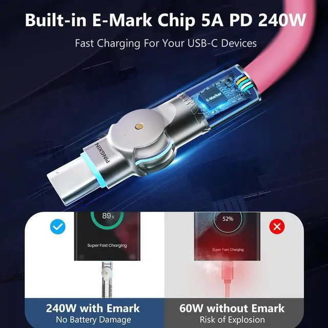 What You Get: PINGXIN USB-C to USB-C 180 degree double head rotationCable (10ft 240W 2-Pack) welcome guide 12-month warranty and our friendly customer service.