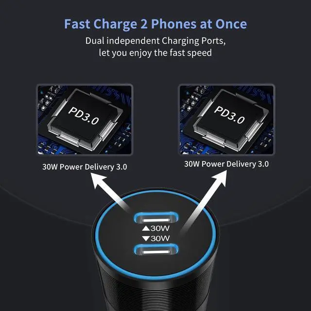 Top charging speed for new phone models - 30W PD 3.0 [33W PPS] supports 25W super fast charging 1.0 provide 70% faster charging speed for Galaxy S25/S24 ultra/S24+/S24/S23 ultra/S23+/S23/S22 ultra/S22+/S22/S21 ultra/S21 plus/S21/S20 fe/S20 ultra/S20 plus/S20 Note 20 Ultra/Note 20/Note 10 Plus/Note 10 A71 Fold 3/2 full charge these phones in 70 minutes. In addition it also supports 30W fast charge for iPhone 16/Pro/Pro Max/Plus 15/Pro/Pro Max/Plus iPad Pro 2022/2021 iPad Air 5 Mini 6 Google 33W fast charge for Google Pixel 8 Pro/8/7 Pro/7a/7Total 60W output - benefit from twin 30W power delivery 3.0 port this car charger can provide full charging speed for two new model phones simultaneously with total 60W high output which surpasses usual PD & QC chargersUniversal compatibility - this car charger is compatible for all Android & iOS devices like Galaxy iPhone Google Pixel iPad LG Motorola etc.
