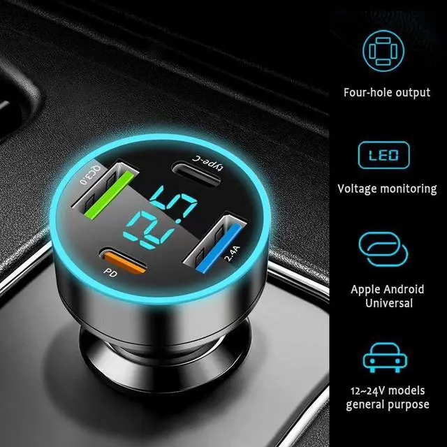 ? Multi Port Fast ChargingEnjoy extreme charging how can you do without it! Our car charger adapter adopts a 4-in-1 design with two fast charging ports PD and QC 3.0 one type-c port and one regular charging port. Can charge your device to over 75% in just 30 minutes! Even if 4 ports are used simultaneously it does not affect its charging speed and safety protection at all!? Voltmeter+Ambient LightThe biggest difference in the appearance of this car charger adapter lies in its voltage digital display meter and soft blue LED ambient light on the outer ring.