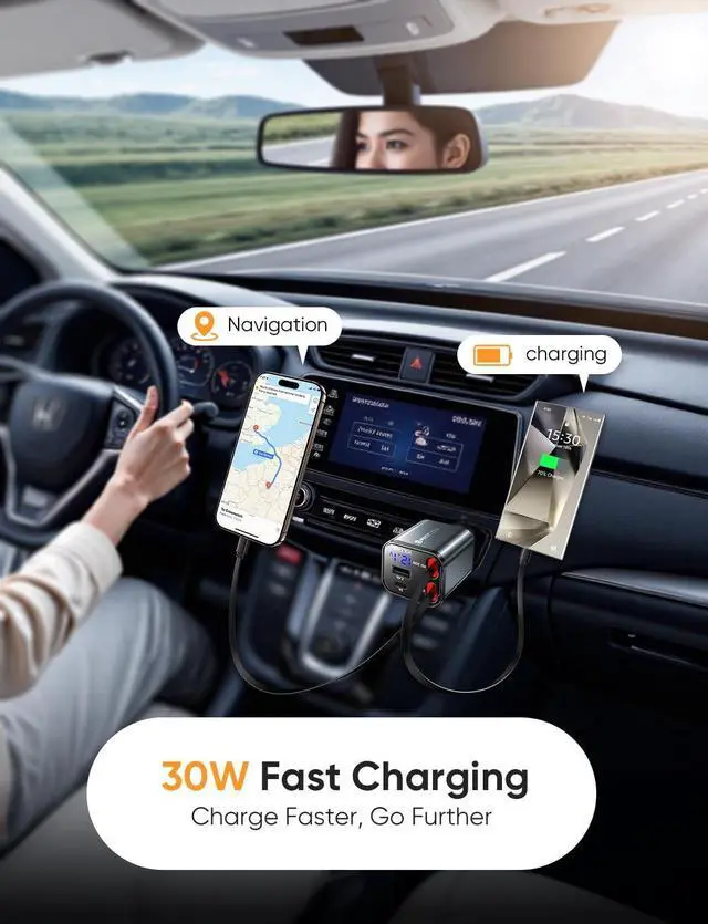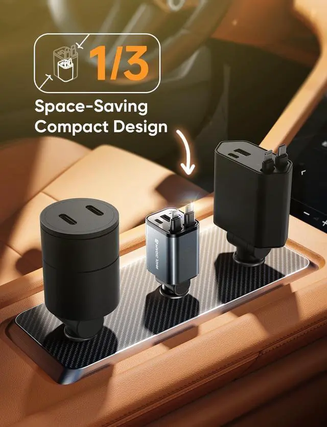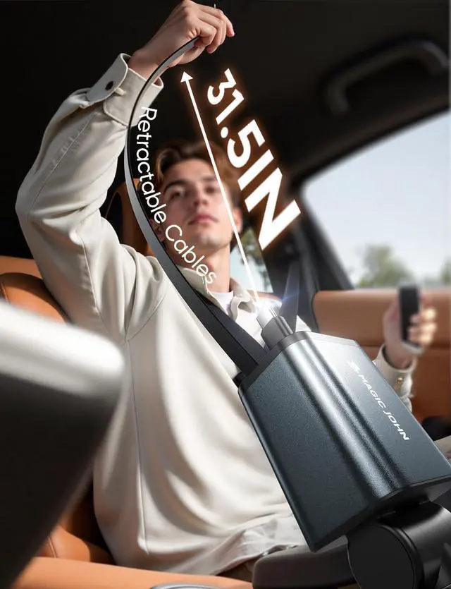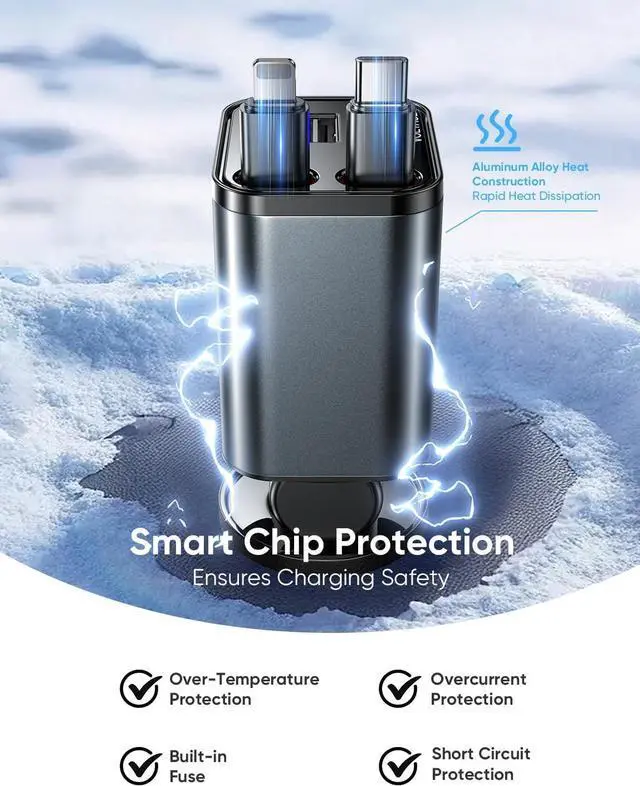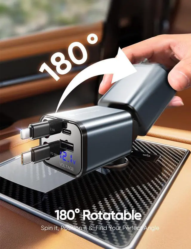 [30W PD Fast Charging & 4-in-1 Design] This versatile car charger delivers 30W PD fast charging and supports four devices simultaneously perfect for families or professionals on the go. It is NOT compatible with CarPlay Bluetooth or data transfer. Works with most phones tablets and small electronics. Say goodbye to cable clutter and enjoy efficient organized charging in your car[Compact & Retractable Cables for Easy Use] Featuring a sleek retractable design simply pull the connector to your desired length until it is fixed. The durable 800mm ( 31.5 -inch) cords retract automatically after fixing saving space and keeping your car tidy[180° Adjustable Charger Plug] The flexible 180° rotating design allows you to easily adjust the chargers position ensuring convenient access to all ports and comfortable charging for multiple passengers[Safe & Reliable Charging Experience] Built with premium aluminum alloy for rapid heat dissipation and equipped with an intelligent chip for over-temperature protection this charger keeps your devices safe while preventing overheating[Universal Compatibility for Most Devices] With four ports (USB USB-C Type-C and IOS) its compatible with a wide range of devices including iPhone Android Galaxy and more making it the perfect charging solution for everyone[24/7 Dedicated Customer Support] Our highly trained customer service team is available 24 hours a day to promptly answer your questions and resolve any issues you may have with the 4-in-1 retractable car charger ensuring a seamless experience