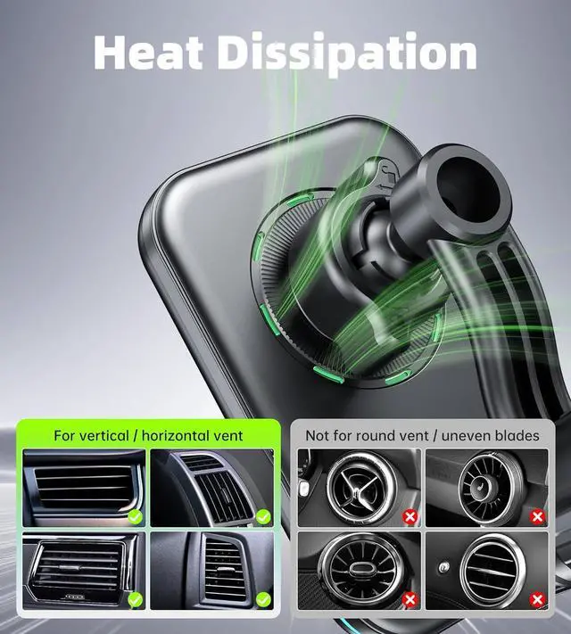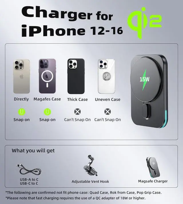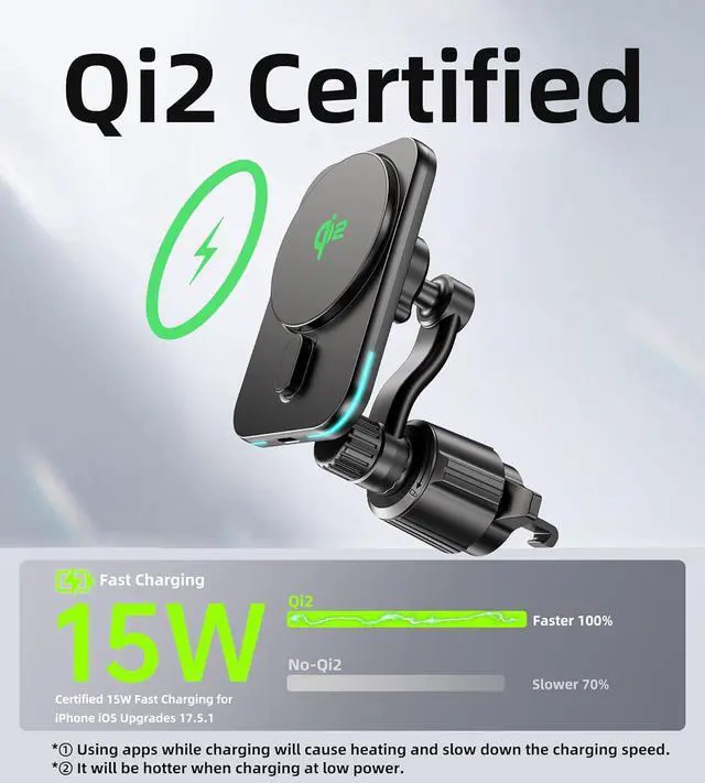 Qi2-Certified Wireless Car Charger: Officially Qi2-certified 15W for MagSafe iPhone charging gives you safer more reliable fast charging it provides 50% faster charging on for iPhone 16/15/14/13/12 series than standard wireless car chargersSpecially Designed for iPhone 16/15/14/13/12