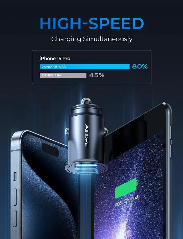 This car charger adapter delivers an impressive total output of 4.8A /24W offering 2.4A /12W per USB port. With a charging speed that's 2X faster than standard 1A/5W chargers it allows you to charge two devices simultaneously at full speedideal for keeping both your phone and tablet powered up on long drives.