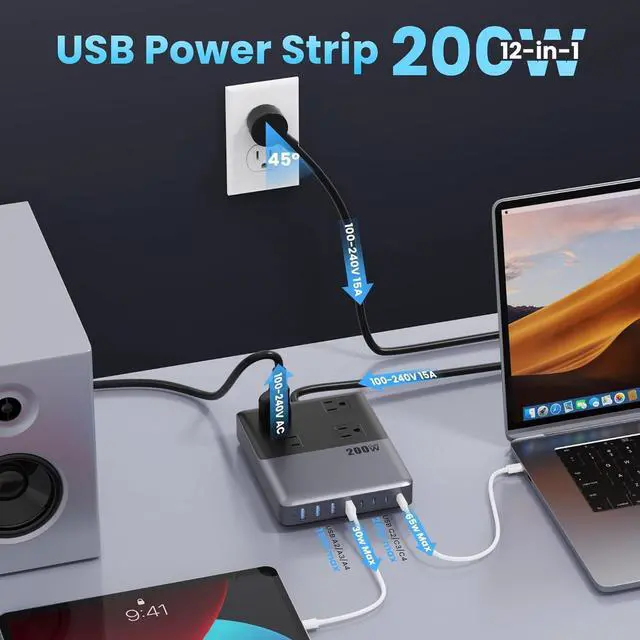 12-in-1 200W Super Fast Charging StationFeatured 4 AC outlets 8 USB ports (4 USB-C+4 USB-A) sharing 200W of power can power up to 12 devices simultaneously this charging station is a perfect combination of usb charger and power strip. One 12 ports versatile usb charging solution provides multi charging options to meet all charging needs of your families ideal for the home office and college dorm room essentials. Widely Compatible Power Strip with USB CThe 12 in 1 multiports power strip equipped with 4 AC and 8 USB ports can power up most of your home appliances laptops and mobile devices at once with ease.