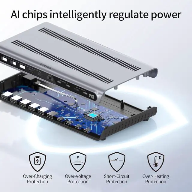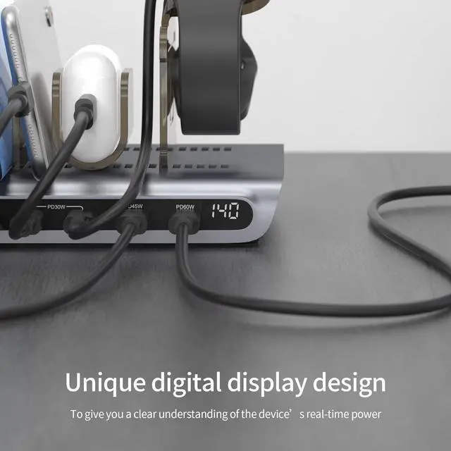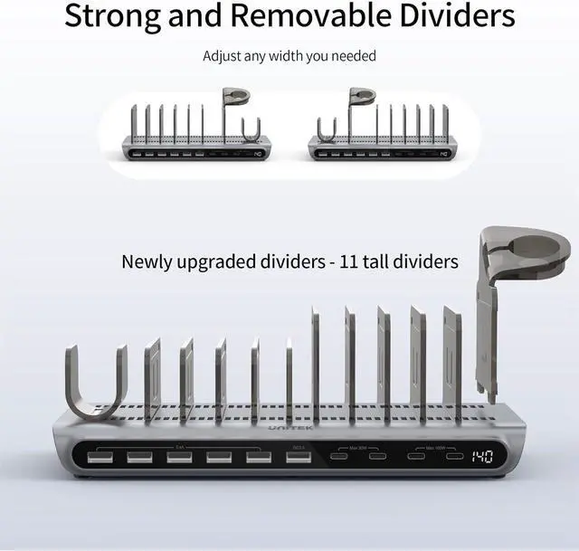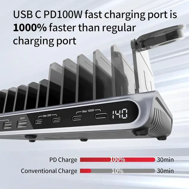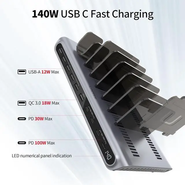 Digital Displayg: Enjoy lightning-fast charging with this 10-port USB charging station that features built-in 4 Type-C PD Ports including 2PD Max 30W 2PD Max 100W. The Type-C PD 100W support fast charging for Chromebook HP and USB-C computer laptops and devices. Type-C PD 30W can charge your iPhone 15/14 series up to 3x faster than the original charger. Stay informed about your device's charging status with Unitek charging station's LED digital display that provides real-time updates.