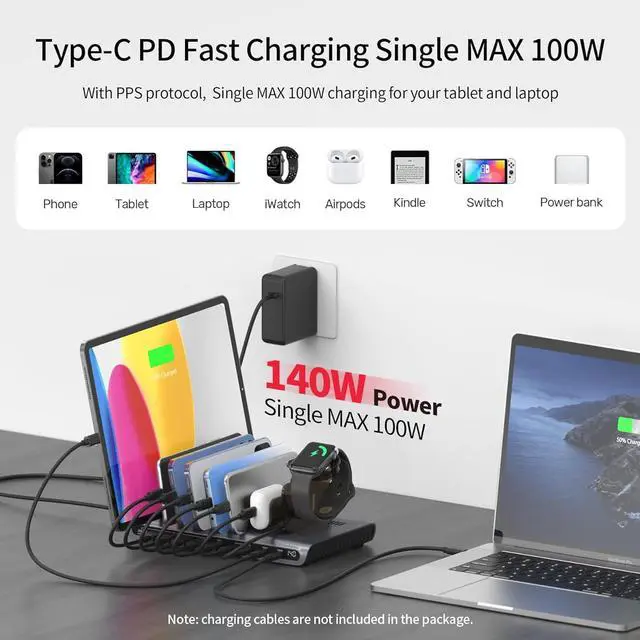 What You Get: You will receive the 10-Port USB Charging Station with Fast Charging Ports Detachable Dividers x 11 iWatch Dividers x 1 AirPods Dividers x 1 GaN 140W Power Adapter x1 and 24h technical support.
