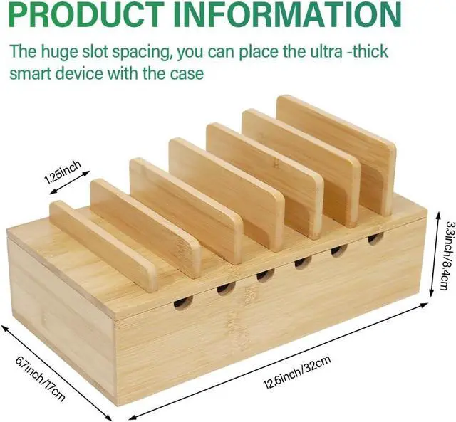 Large Compartment Above: The distance between each baffle is 1.25 inches. Basically all smart devices can be placed the device with a protective shell can be placed and multiple mobile devices can be placed at the same time. Farewell to the messy desktop.? WHAT DO YOU GET- A large bamboo charging station organizer 6 Pack charging & sync data cable (3xiPhone cables 2xType-C cables 1xAndroid cable). Quality & safety assurance is our eternal pursuit and promise. If you have any issue please contact us immediately & well get back to you within 8 hours until you are satisfied. Click Add to Cart to order now.