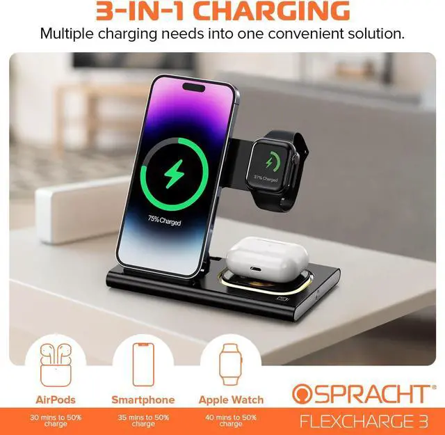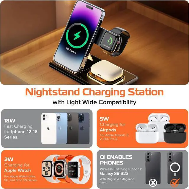 FOLDABLE & PORTABLE: Compact foldable design makes it a great 3-in-1 charger for home or travel use. Also serves as a 3-in-1 charging station.