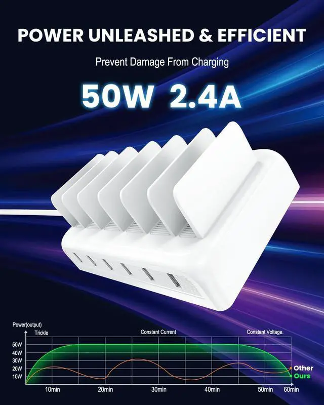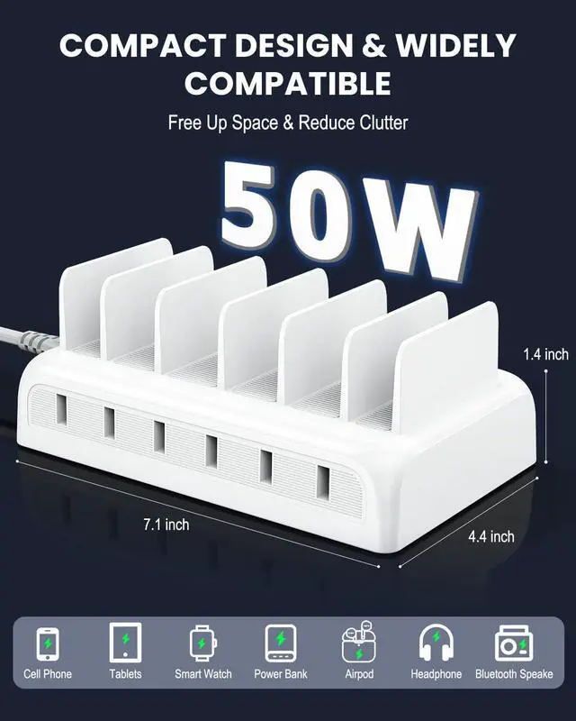 Charging Station: Honcila 50W 6 port USB-A charging station is designed to solve the problem of multi-device charging. It can charge and store 6 devices with only one wall outlet instantly freeing up more power sockets. Our multi-device charging station total output power is up to 50W and the maximum current of a single port is 2.4A which is 3 times faster than ordinary chargers. It only takes 35 minutes to charge your device 0-50% greatly shortening the charging time. One-click to create a tidy and efficient charging center.