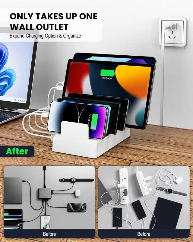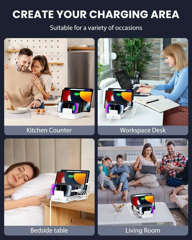 Thoughtful Gift: With full coverage from home to commercial scenarios our multi phone charger fast charging station provides efficient charging solutions for office places such as conference rooms and front desks. This multi port cell phone charging station can help you centrally manage and charge multiple devices at the same time. It is very suitable for home kitchen counters bedside tables workspaces offices classrooms hotels cafes travel and other occasions.