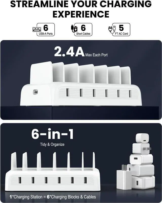One-Stop Charger Station Customer-Friendly Features: Honcila charging stations use a single power supply to power 6 devices at the same time. Equipped with 6 USB-A interfaces and 3 types a total of 6 charging cables you dont need to buy additional cables and multiple charging blocks nor need to plug multiple wall chargers into the power outlet. Completely say goodbye to tangled cords and bulky adapters. Intelligent Safety