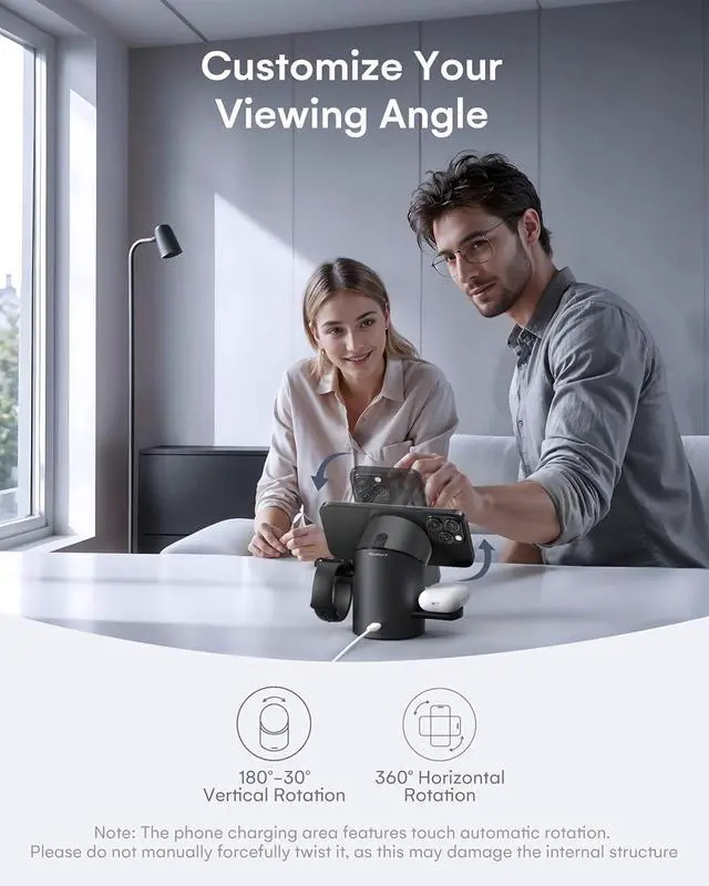 Smart Touch Control: Experience effortless operation with this iPhone charging station featuring instant touch activation The rotating phone charging area that doubles as a phone stand allowing for easy viewing while charging. The charging docks for your AirPods and Watch pop up with a press saving space and keeping your setup organized when not in use.