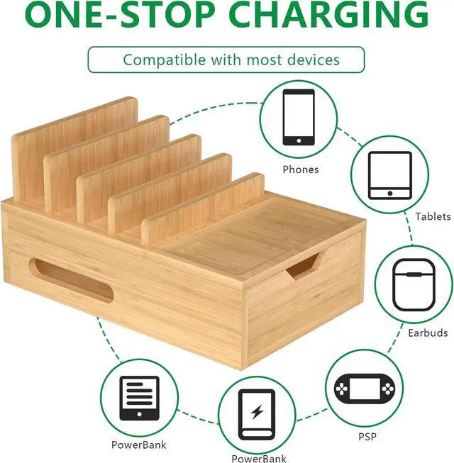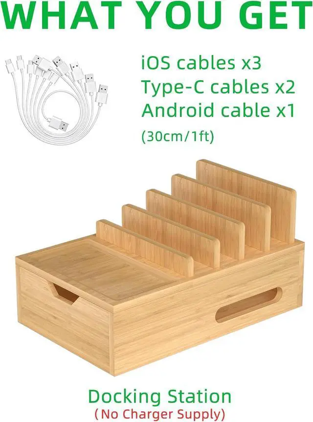 ? Compatible with Multi DevicesIt can accommodate up to 7 devices at the same time and has different slot widths. Whether it's a tablet power bank phone headphones and game player our charging station has got you covered.? Suitable for Multi OccasionsThis charging Organizer is larger than others and has great storage and organization capabilities. It is perfect for offices classrooms restaurants hotels and homes that have multi devices and items and keep them neat and tidy. The bamboo desk organizer is also suitable as a gift for family friends and colleagues.? What You Get1 docking station 6 data cables (including 3xiPhone cables 2xType-C cables and 1xAndroid cable) to ensure compatibility with various devices.