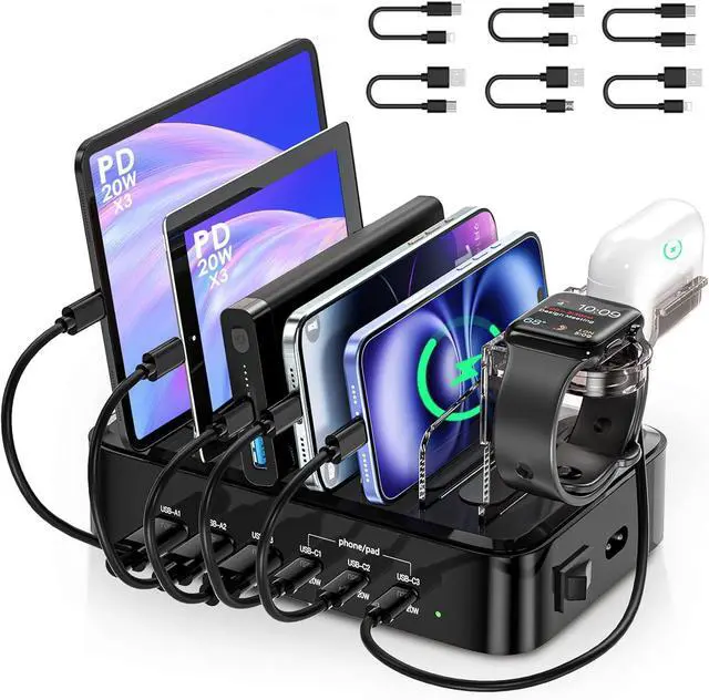 Universal Compatibility: This versatile for multiple charging station for all devices works with a wide range of devices including the latest i`Phones 15 series Galaxy S23 series Pads Kindles and more. The package includes 6 short charging cables and a dedicated Watch and Air-Pods holder for all your charging needs?