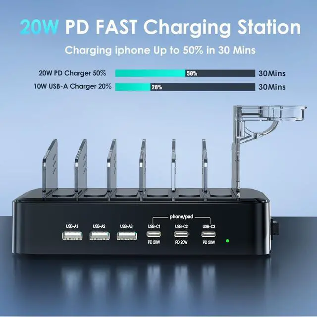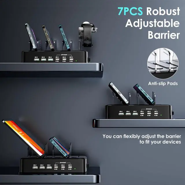 Sturdy Thoughtful Design: Built to last with high-quality flame-retardant ABS material our fast charging station usb c charging dock features durable dividers for a flexible and customizable setupensuring long-term reliability and stability for all your devices?