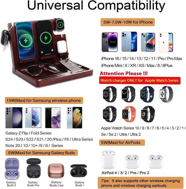Compatibility: This 2 phone charging station is wide compatible with iPhone and other wireless android phone Watch AirPod etc solved 2 more phone and watch charging problem perfectly. It's an ideal cell phone charging station for multiple devices making it a versatile charging hub for all your tech gadgets. Really good an charging station wood for fans.