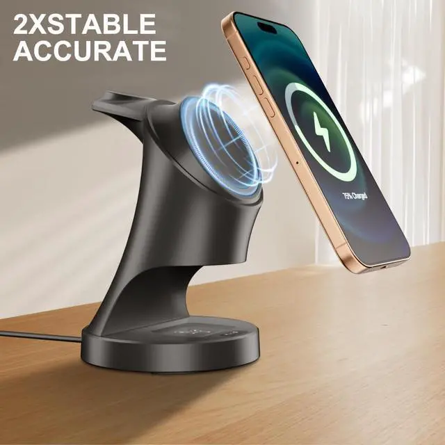 Charger Stand: Snap your iPhone to the mag-safe charging stand and put the Watch on the magnetic watch charging module. The powerful magnetic alignment ensures that your devices are accurately and seamlessly attached to the center of the wireless charging stand. Even with your eyes closed you can pinpoint the right charging center for your phone instantly. Turn your iPhone on its side while charging perfectly fits the iOS StandBy Mode. 3.?? Fast