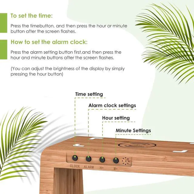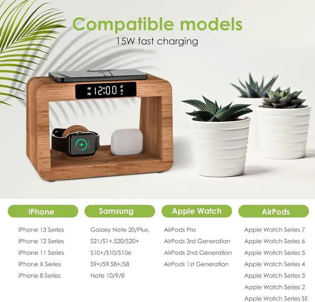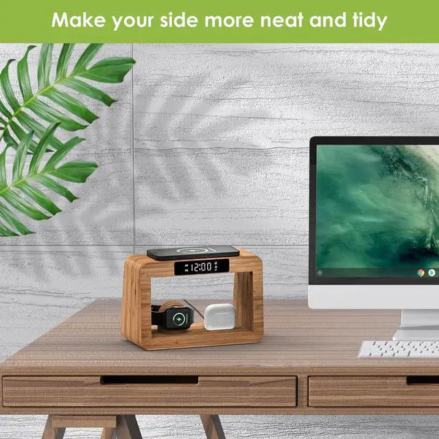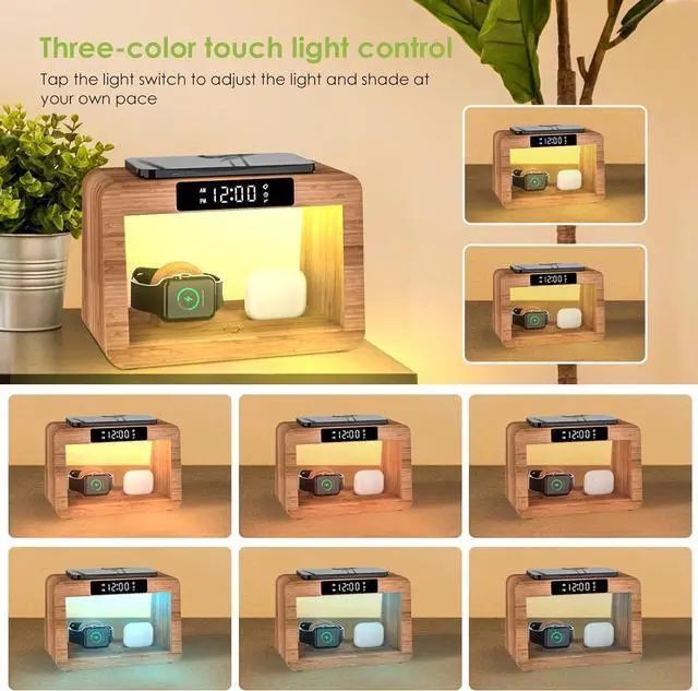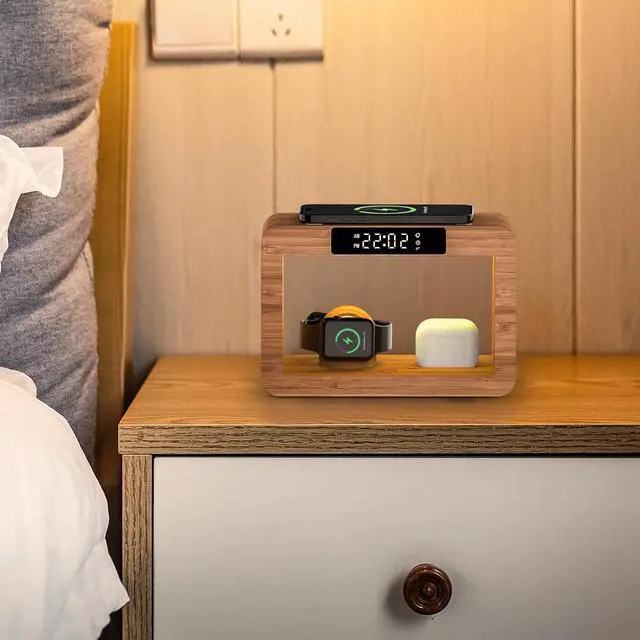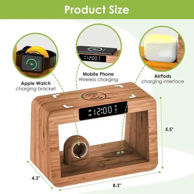 (Note: Iwatch Charger NOT INCLUDED)Keep Safe phone and Watch Charging Station integrates multiple safety features including overcurrent protection overvoltage protection over-temperature protection short-circuit protection and foreign object detection ensuring safe and fast charging for your devices. For better experience we recommend removing your phone case. Digital Alarm ClockIphone Alarm Clock Docking Station is equipped with a digital display clock and alarm clock function. The brightness of the clock display screen can be adjusted or even turned off. 3 Modes Night Light Phone and watch charging station features a built-in night light with three colors and adjustable brightness. The charging stand offers warm natural and cool light options. You can control the light color brightness and turn it off with a simple touch. Made from natural bambooFamily charging station organizer adds a clean earthy vibe to your nightstand. Its smooth sustainable bamboo finish blends effortlessly with any decormodern minimalist or cozy. Its not just a charger but a simple natural accent that brings a touch of the outdoors to your space. Practical Thoughtful Gift Nightstand Charging Station makes for the perfect gift to delight your lovedspouseparents ildrenpartnersiblings riends -workers even your bosson occasions like birthdays anniversaries Father's Day Christmas and other special moments.