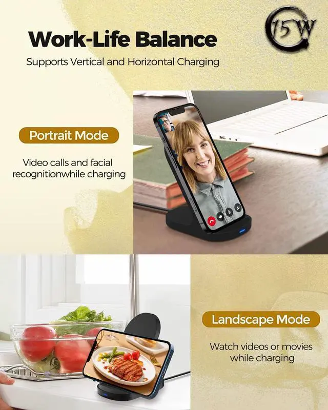 Vertical and Horizontal Charging: The iPhone Wireless Charger has a stylish and practical design. In addition to being able to charge your phone horizontally or vertically, it also provides the perfect viewing angle for your eyes. Whether watching movies, listening to music, calling or texting, the entire charging process will not be interrupted.