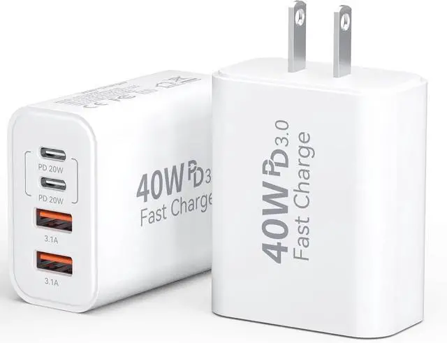 2-Pack 40W Fast Charging Block4-port 40w usb c Wall Charger block can provide maximum 40w power for your devices, The pd 3.0 USB-C port supports a maximum power output of 20W for you iPhone, i-pad, Pixel, Samsung galaxy and more. Usb c charging block offers fast and efficient charging up to 3X faster than a 5W charger block. Charge for iPhone devices from 0% to 60% in just 30 minutes.