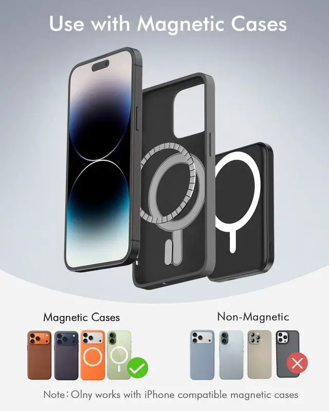 Charging with Magnetic Phone Case: We recommend charging with MagSafe phone case or without cases to get enough suction (Using a non-magnetic phone case will cause the phone to not adsorb properly)
