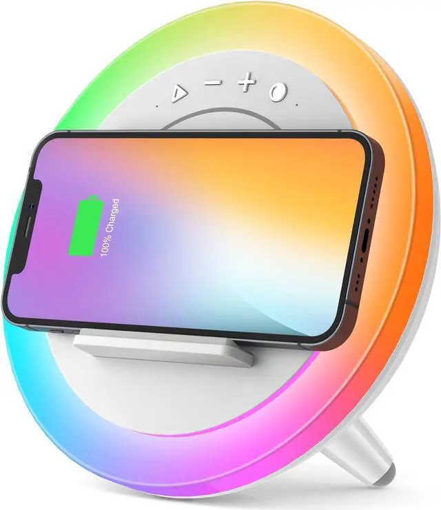 as: Bluetooth speaker + night light + wireless charging station + phone holder, humanized buttons allow you to easily control volume, skip songs, answer calls to switch play or light mode, very suitable for Bedroom. Gifts for couples, boys, Father' s DayUse the adapter provided with the product to start up normally