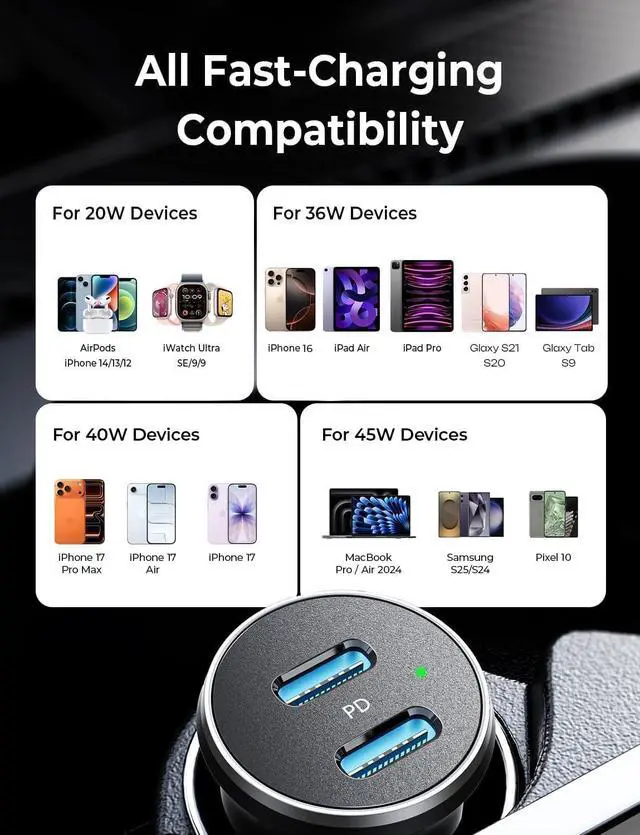 THROW AWAY THE OLD A+C CAR CHARGER: What sets the LISEN usb c cigarette lighter adapter fast charger for iphone 16 pro max apart is its dual USB-C ports, each capable of delivering up to 45W of powerThis configuration is particularly beneficial for users looking to fast charge two high-power devices at once, such as an iPhone 16 Pro Max and an iPad Pro. The simultaneous 45W output is a game-changer, significantly reducing charging times and ensuring your devices are ready to go when you are