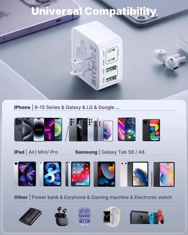 Universal Compatibility Wall Plug: The USB C charger plug due to the special 4-port, the USB C charger is compatible with almost all electronic devices, charging adapter for iPhone 15/15 Pro /15 Pro Max/14/14 Pro/14 Pro Max/13/13 Mini/13 Pro Max/12/12 Pro Max/12 Pro Max/12 Mini/SE 2020/11/11 Pro/11 Pro Max/XR/XS/X/8/7, iPad Air/Pro/Mini, Sam sung Galaxy S22/S21/S20/S10/S8/A12/A13/A22/A32/A52/A53/A71/Note 20 10, Tablets, LG, Motorola, Google Pixel and other digital devices compatible.