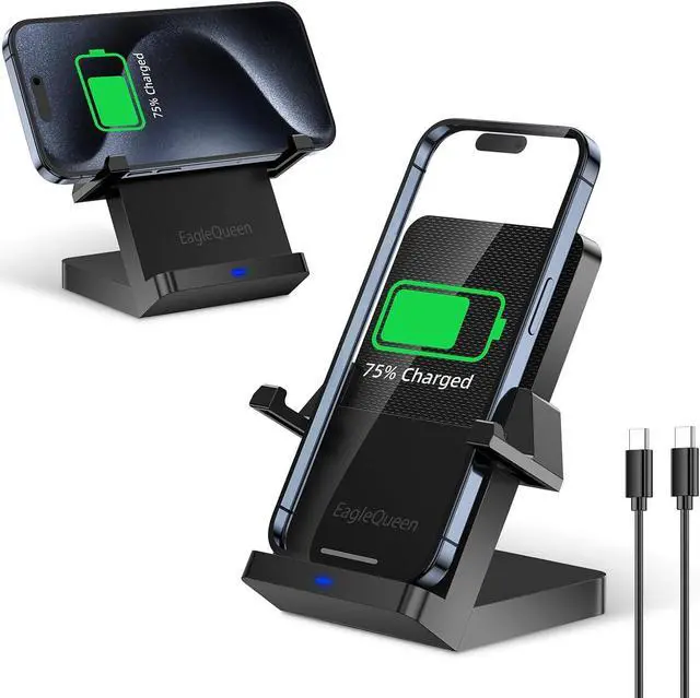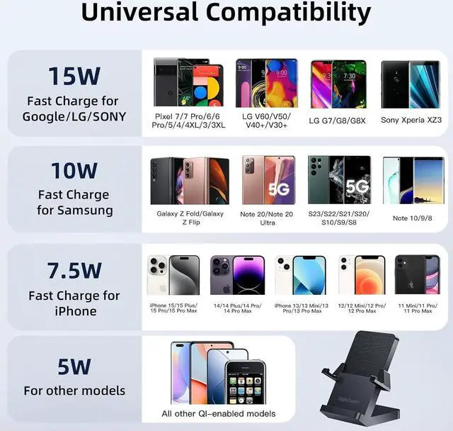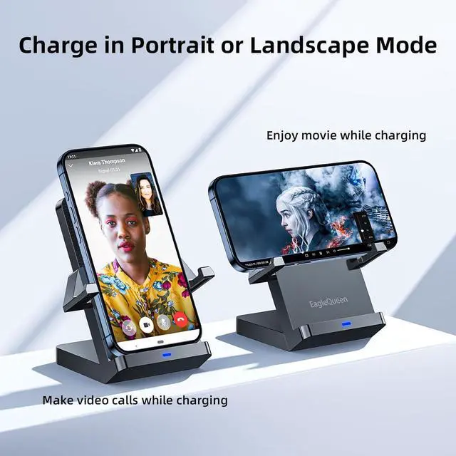 VERSATILE DEVICE COMPATIBILITY: EagleQueen wireless charger stand is universally compatible, supporting the latest iPhone and Samsung Galaxy models, as well as other popular devices like LG, Google, and Pixel, ensuring a seamless charging experience for a variety of smartphones.