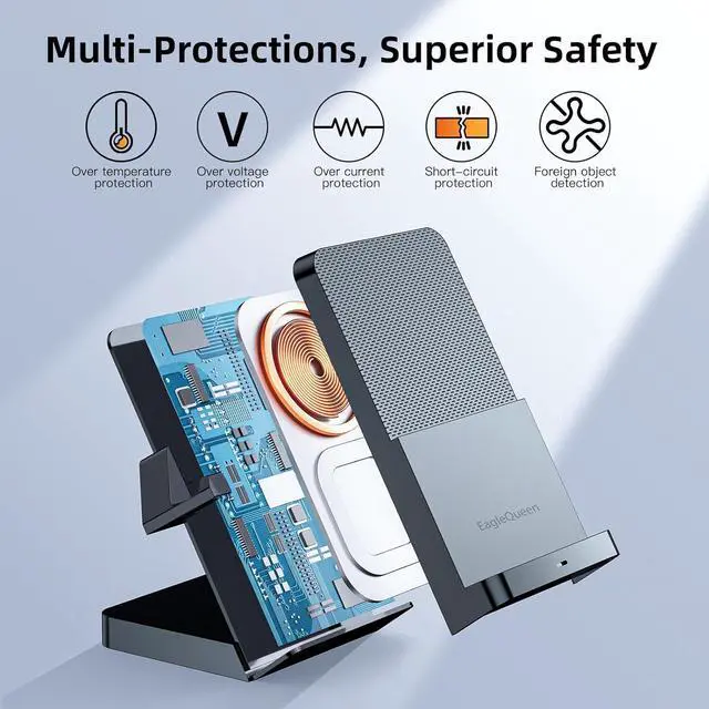 COMPREHENSIVE SAFETY FEATURES: Elevate your charging experience with EagleQueen' s charging station, equipped with multiple safety protections such as over temperature, over voltage, over current, short-circuit, and foreign object detection, ensuring the safety of your devices during every charging session.