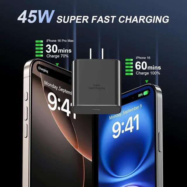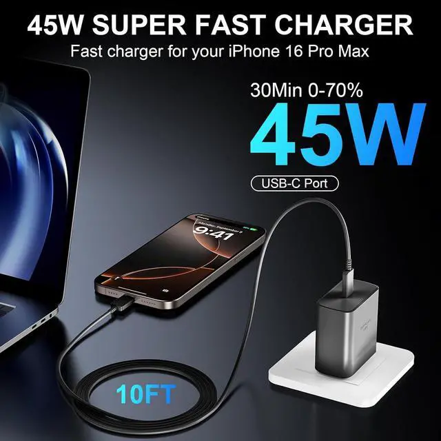 Pro Max Charger Fast Charging: The 45W Phone 17 16 Fast Charger USB C Block with 8FT extra long USB C to USB C fast charger cable cord provide Max 45W output power, charge your Phone 17 16 Pro Max up to 70% in just 30mins, 6X faster than the original 20W USB C charger