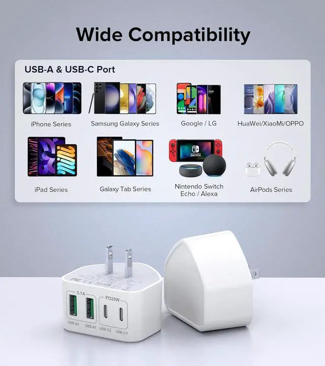 Universal compatibility: Cell phones, watches, earphones, portable chargers, tablets, wireless fans, and wireless chargers can all be used with this USB C power adapter. Compatible with iPhone 17 16 15 14 13 Pro Max XS XR 8 Plus, iPad Pro, Samsuang Galaxy S24 S23 S22 S21 S20 S10 S9 S8 A12 A13 A22 A32 A52 A53 A71 Note 20 10, LG, Motorola, Google Pixel